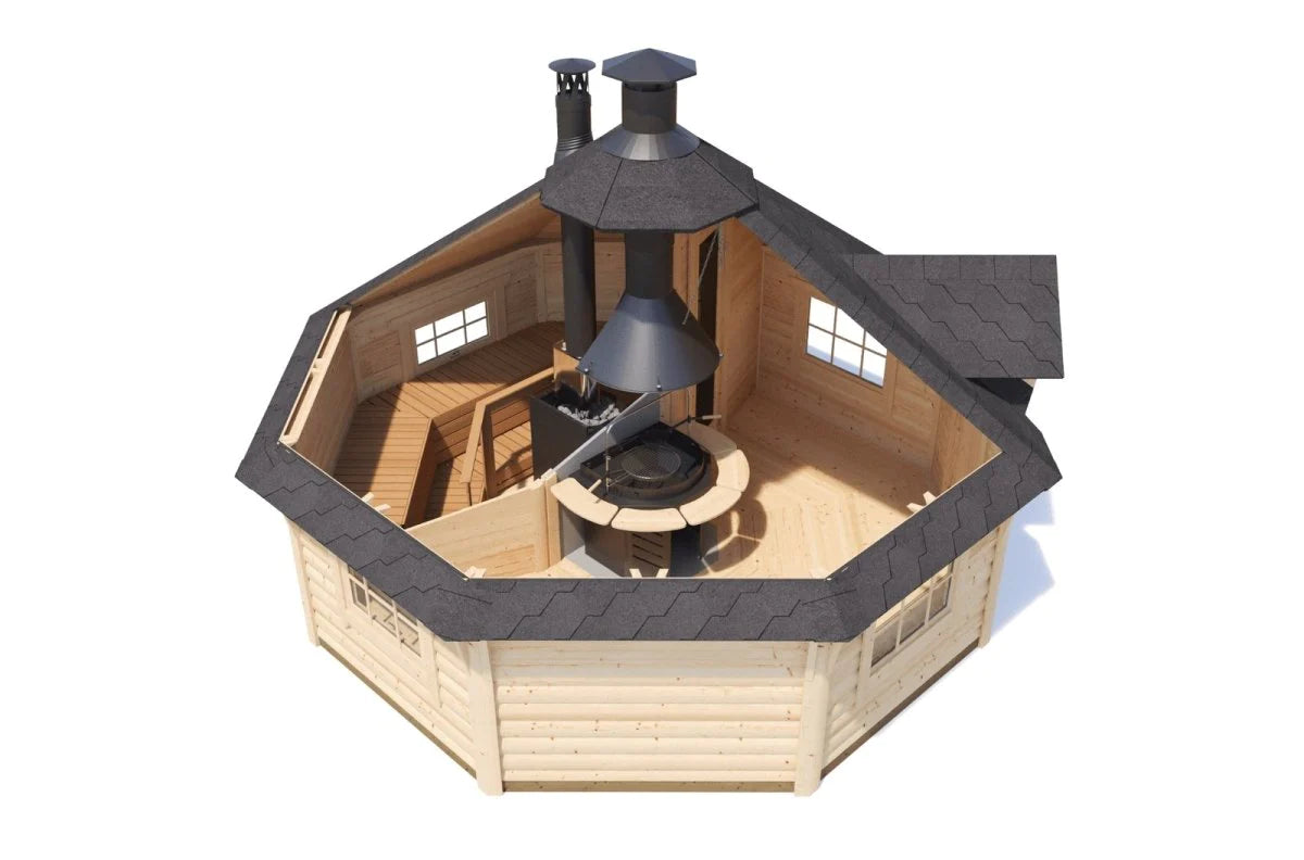 Een grillkota, de Finse grillhut, brengt een stukje Scandinavië rechtstreeks in uw tuin. Het karakteristieke, zes- of achthoekige ontwerp, gecombineerd met de robuuste houten constructie, biedt niet alleen bescherming tegen de elementen, maar ook een warme en uitnodigende sfeer. Of het nu voor een barbecuefeest in de zomer is of een gezellig samenzijn in de winter – de grillkota is het hele jaar door de perfecte plek voor gezellige uren.