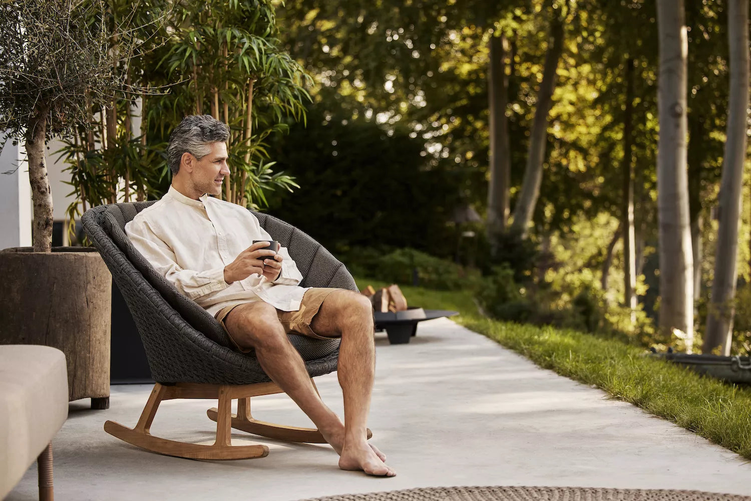 Der Peacock Schaukelstuhl von Cane-line, entworfen vom dänischen Designerduo Foersom & Hiort-Lorenzen MDD, vereint skandinavisches Design mit höchstem Sitzkomfort. Die Kombination aus handgeflochtenem Cane-line Soft Rope und einem Untergestell aus hochwertigem Grade A-Teakholz macht diesen Schaukelstuhl zu einem stilvollen und langlebigen Möbelstück für den Außenbereich.