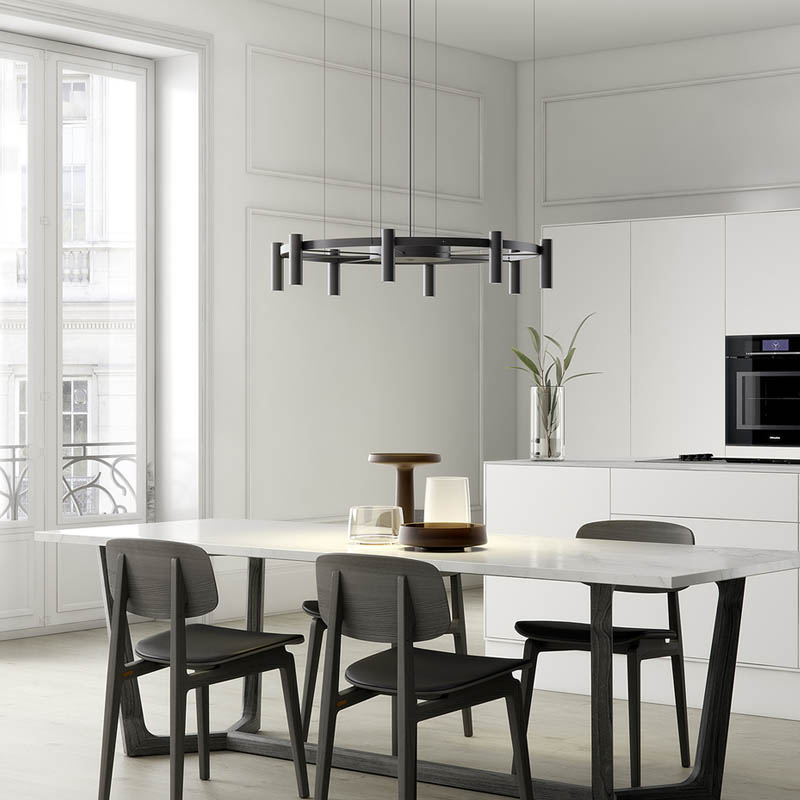 Die Laverd T-3805 Pendelleuchte von Estiluz, entworfen von Zachi Jacobovich, interpretiert den klassischen Kronleuchter neu. Ihr Design erinnert an eine stilisierte Radform mit acht zylindrischen Leuchtenköpfen, die sowohl nach oben als auch nach unten gerichtetes Licht abgeben. Diese Anordnung sorgt für eine gleichmäßige direkte und indirekte Beleuchtung und schafft eine angenehme Atmosphäre in verschiedenen Räumen.