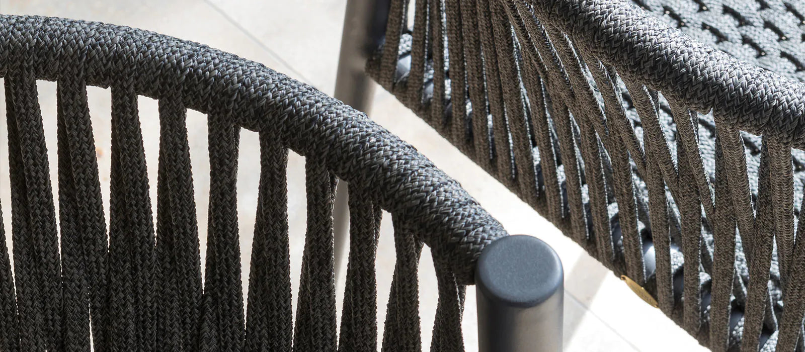 Rückenlehne & Sitzfläche: Handgewebtes Seil aus Polyolefin – extrem widerstandsfähig, UV-beständig und optisch ansprechend.