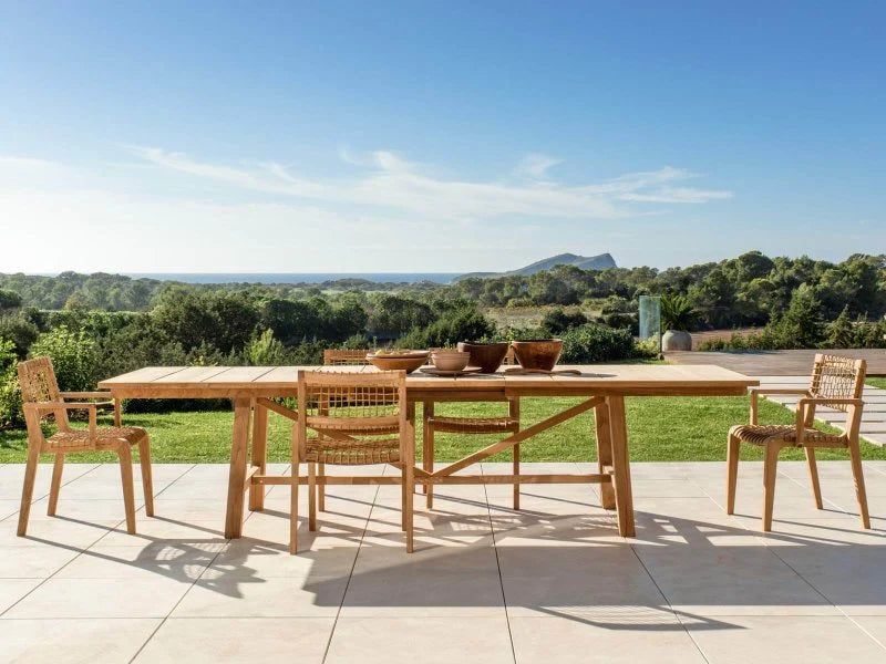 Die Synthesis Essgruppe von Unopiù vereint elegantes Design und Funktionalität für Ihren Außenbereich. Diese Gruppe, bestehend aus einem rechteckigen, ausziehbaren Tisch und einer Kombination aus Stühlen und Armstühlen, ist vollständig aus hochwertigem Teakholz gefertigt und bietet eine robuste sowie ästhetisch ansprechende Lösung für gemeinsame Mahlzeiten im Freien.